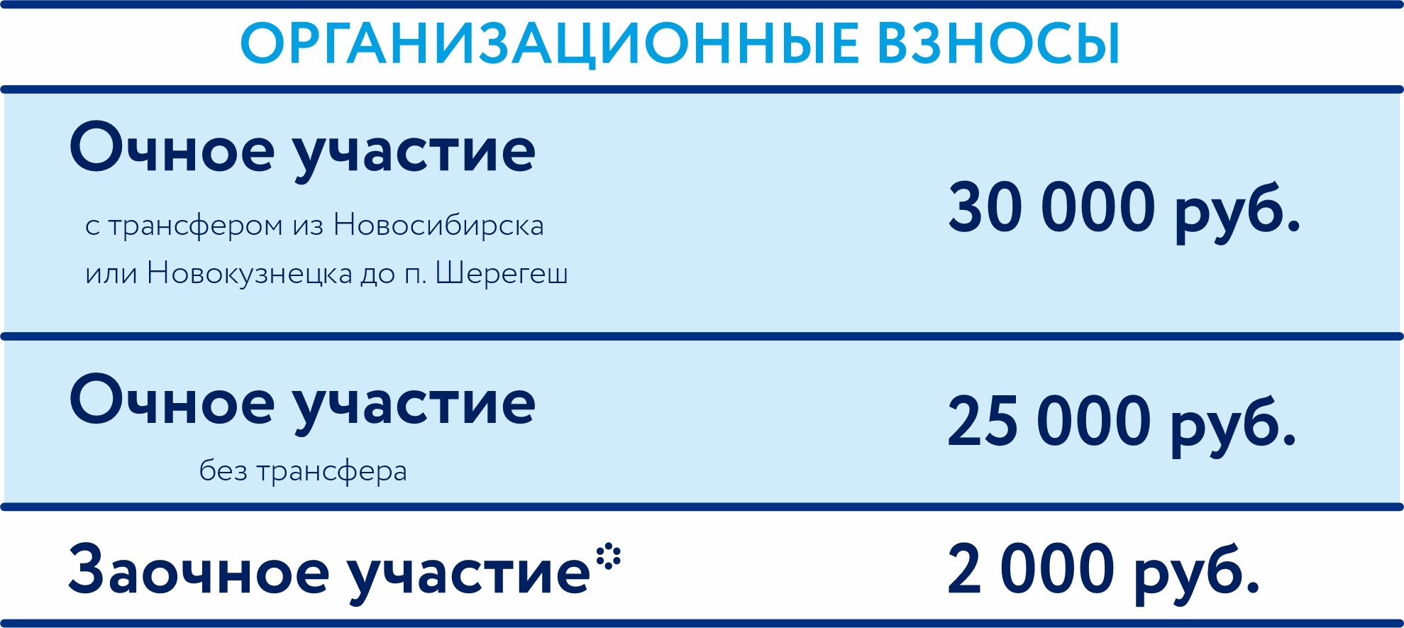 Взнос включает посещение всех научных сессий, публикацию тезисов одного доклада, портфель участника, научно-популярные мероприятия, кофе-брейки, фуршет.